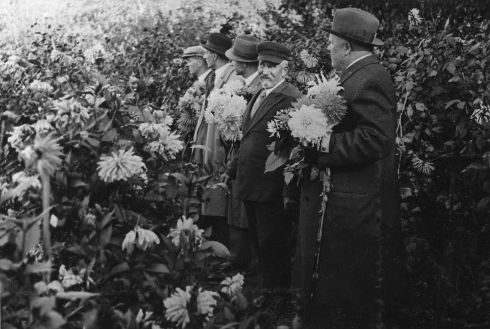 Latvijas Valsts un Ministru prezidents Kārlis Ulmanis viesojas Jāņa Puguļa dāliju audzētavas dārzā Kandavas ielā 3. No labās: 1. Kārlis Ulmanis ar dālijām rokās, 2. dārznieks Jānis Pugulis.