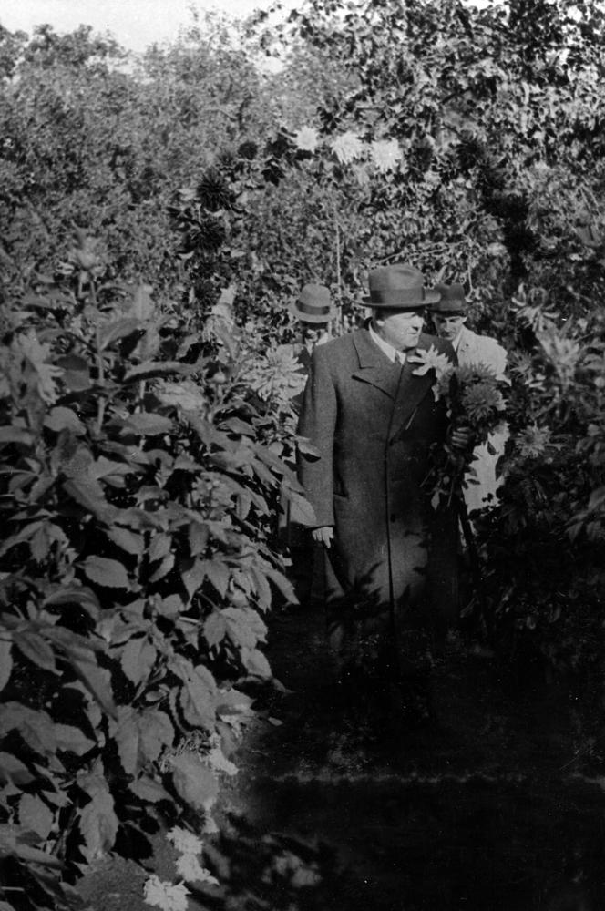 Latvijas Valsts un Ministru prezidents Kārlis Ulmanis Jāņa Puguļa dāliju audzētavas dārzā Kandavas ielā 3.
