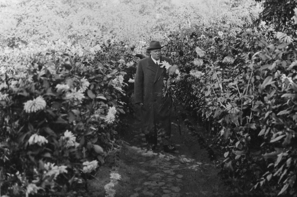 Latvijas Valsts un Ministru prezidents Kārlis Ulmanis Jāņa Puguļa dāliju audzētavas dārzā Kandavas ielā 3.