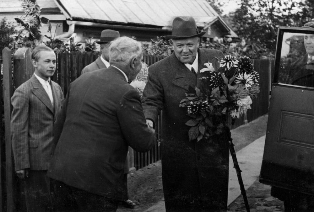 Latvijas Valsts un Ministru prezidents Kārlis Ulmanis viesojas Jāņa Puguļa dāliju audzētavā Kandavas ielā 3. Pie mājas uz ielas stāv Kārlis Ulmanis ar dālijām rokā, priekšplānā dārznieks Jānis Pugulis.