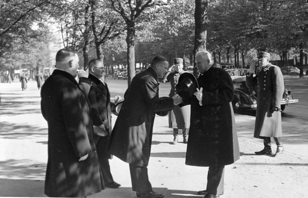 Latvijas ugunsdzēsēju lielā skate (ugunsdzēsēju lielā parāde) Vienības laukumā (tagad Esplanāde). Latvijas Valsts un Ministru prezidenta Kārļa Ulmaņa sagaidīšanā no kreisās: 2. Rīgas pilsētas galva Roberts Liepiņš, 3. iekšlietu ministrs Vilis Gulbis, 4. prezidents Kārlis Ulmanis.