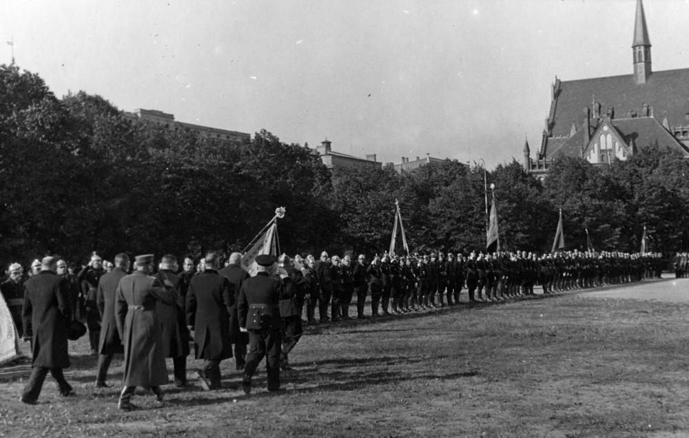 Latvijas ugunsdzēsēju lielā skate (ugunsdzēsēju lielā parāde) Vienības laukumā (tagad Esplanāde). Latvijas Valsts un Ministru prezidents Kārlis Ulmanis apstaigā ugunsdzēsēju parādes dalībniekus.