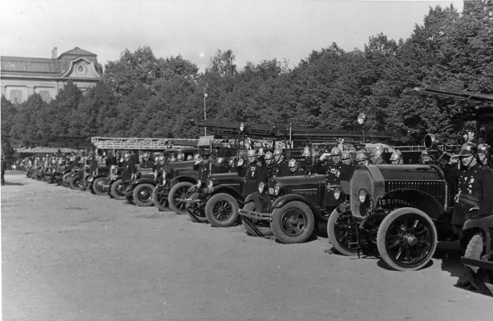 Latvijas ugunsdzēsēju lielā skate Vienības laukumā (tagad Esplanāde). Ugunsdzēsēju mašīnu parāde.