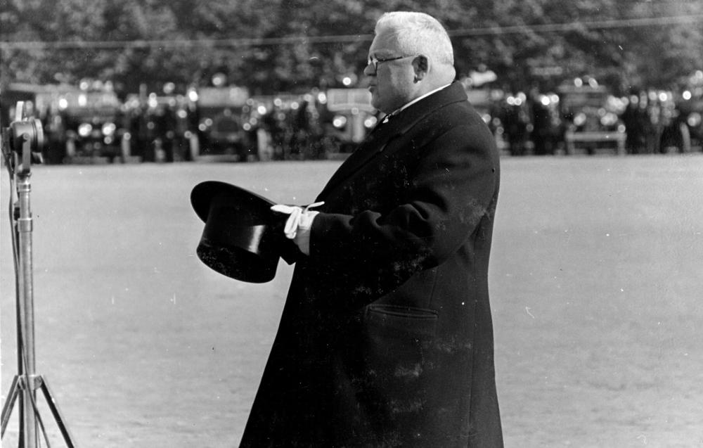 Latvijas ugunsdzēsēju lielā skate (ugunsdzēsēju lielā parāde) Vienības laukumā (tagad Esplanāde). Latvijas Valsts un Ministru prezidents Kārlis Ulmanis uzrunā ugunsdzēsēju skates dalībniekus.