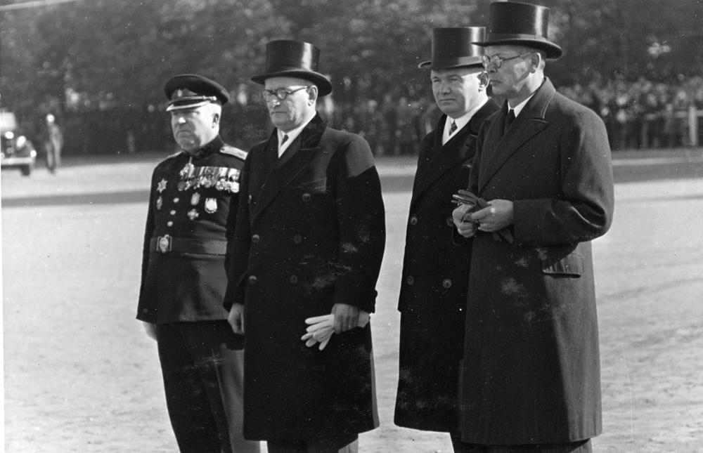Latvijas ugunsdzēsēju lielā skate (ugunsdzēsēju lielā parāde) Vienības laukumā (tagad Esplanāde). No kreisās: 1. Latvijas ugunsdzēsēju savienības priekšsēdētājs Alberts Krieviņš, 2. Rīgas pilsētas galva Roberts Liepiņš, 3. inženieris, Iekšlietu ministrijas Pašvaldību departamenta Būvniecības pārvaldes priekšnieks Parsivals Miezis (Persivals Miezis), 4. iekšlietu ministrs Vilis Gulbis.