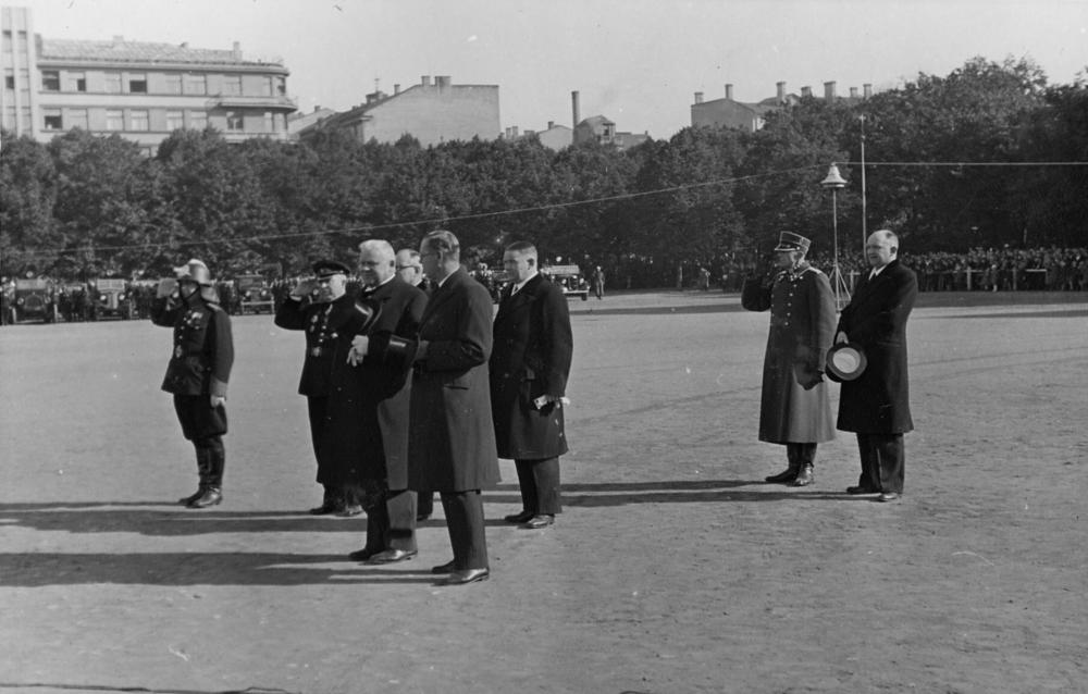 Latvijas ugunsdzēsēju lielā skate (ugunsdzēsēju lielā parāde) Vienības laukumā (tagad Esplanāde). Atklāšanas brīdī no kreisās: 1. Rīgas ugunsdzēsēju brigādes komandieris majors Vilis Sniķeris, 2. Latvijas ugunsdzēsēju savienības priekšsēdētājs Alberts Krieviņš, 3. Latvijas Valsts un Ministru prezidents Kārlis Ulmanis, 4. iekšlietu ministrs Vilis Gulbis, 5. inženieris, Iekšlietu ministrijas Pašvaldību departamenta Būvniecības pārvaldes priekšnieks Parsivals Miezis, 4. Rīgas pilsētas policijas prefekts Pēteris Pommers.