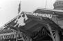 Latvijas ugunsdzēsēju lielā skate. Vienības laukumā tribīnes ar ugunsdzēsēju emblēmu un devīzi "Viens par visiem, visi par vienu".