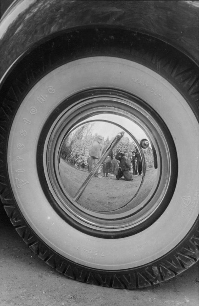 Latvijas Valsts un Ministru prezidenta Kārļa Ulmaņa brauciena uz Suntažiem ekskorta automašīnas riteņa diska atspulgs (atspulgā redzams prezidents Kārlis Ulmanis?).