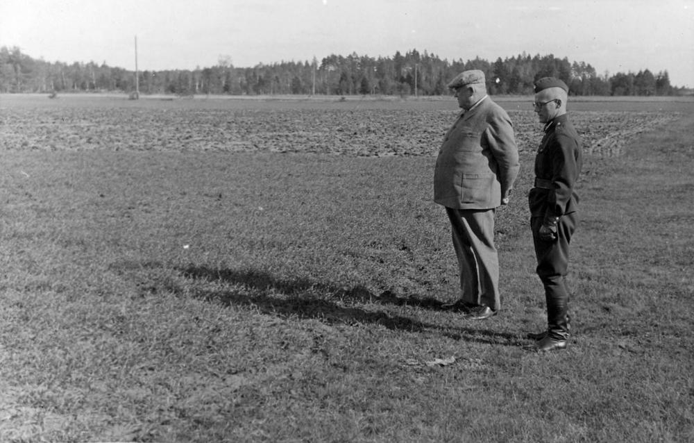 Latvijas Valsts un Ministru prezidents Kārlis Ulmanis viesojas Suntažu pagastā. Uz lauka no kreisās: 1. Kārlis Ulmanis, 2. prezidenta sekretārs Jānis Visvaldis Cimermanis (kopš 1940. gada Jānis Visvaldis Rudums).
