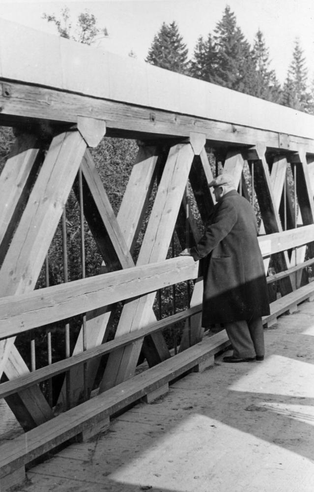 Latvijas Valsts un Ministru prezidents Kārlis Ulmanis Suntažu pagastā dzelzceļa līnijas Rīga-Suntaži-Ērgļi izbūves laikā uz dzelzceļa tilta.