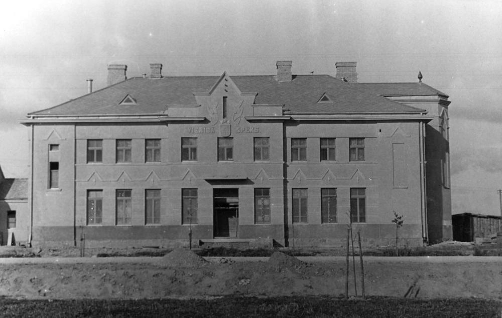 Suntažu stacijas ēkas jaunceltne. Uz ēkas uzraksts "Vienībā spēks". Stacijas ēka celta pēc inženiera Jāņa Šarlova projekta dzelzceļa līnijas Rīga-Suntaži-Ērgļi izbūves laikā, atklāta 1937. gadā.
