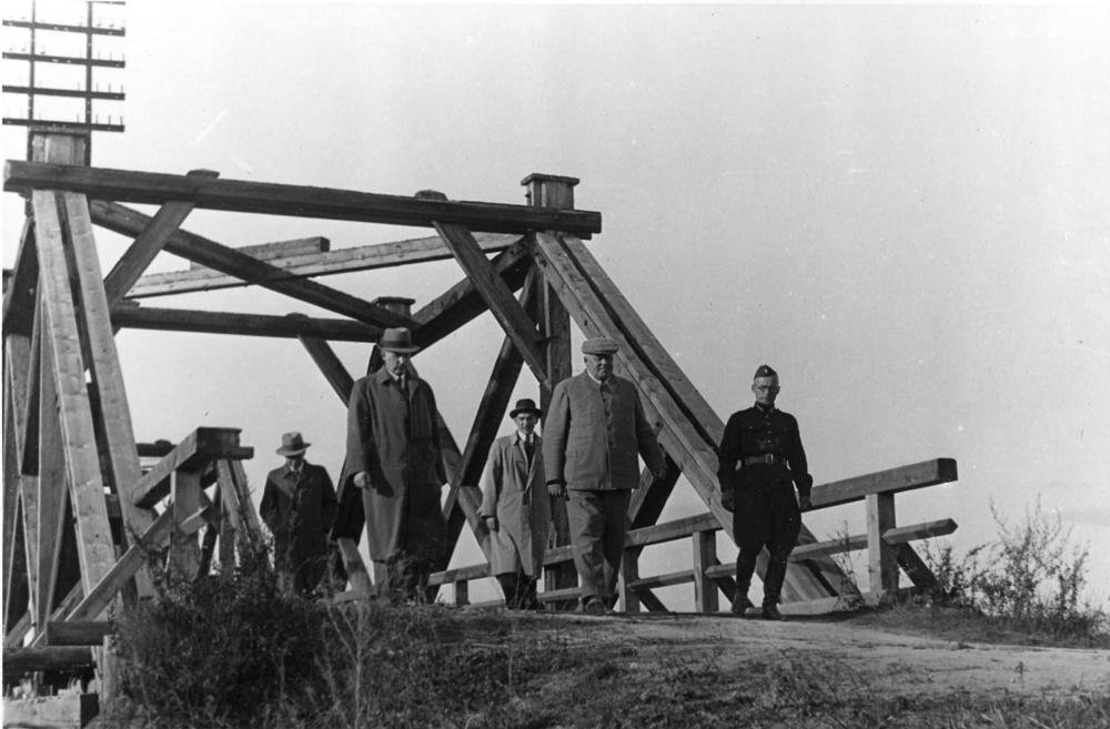 Latvijas Valsts un Ministru prezidents Kārlis Ulmanis (centrā) dzelzceļa līnijas Rīga-Suntaži-Ērgļi izbūves laikā Suntažos pie dzelzceļa tilta (Mazās Juglas tilts). No labās: 1. prezidenta sekretārs Jānis Visvaldis Cimermanis (no 1940. gada Jānis Visvaldis Rudums).