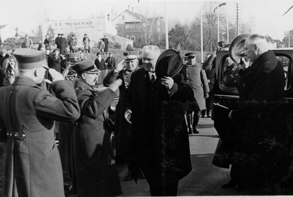 Pieminekļa kritušajiem 6. Rīgas kājnieku pulka kareivjiem atklāšana Sudrabkalniņā. Latvijas Valsts un Ministru prezidenta Kārļa Ulmaņa (centrā) sagaidīšana. No kreisās: 2. Vidzemes divīzijas komandieris ģenerālis Fricis Virsaitis.