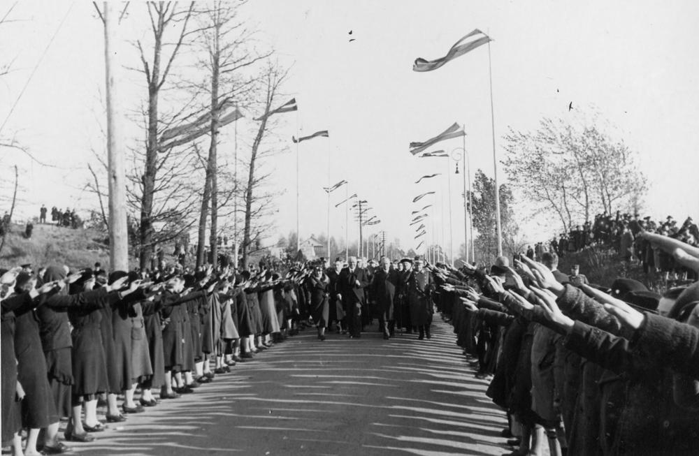 Pieminekļa kritušajiem 6. Rīgas kājnieku pulka kareivjiem atklāšana Sudrabkalniņā. Latvijas jaunatne, mazpulki ierindā sagaida Latvijas Valsts un Ministru prezidentu Kārli Ulmani un goda viesus. No kreisās: 1. Rīgas kājnieku pulka pieminekļa celšanas biedrības priekšniece Emma Albertiņa - Balode, 2. Kārlis Ulmanis, 3. kara ministrs Jānis Balodis, 4. Latvijas armijas kapelāns Pēteris Apkalns, 5. Latvijas armijas komandieris ģenerālis Krišjānis Berķis.