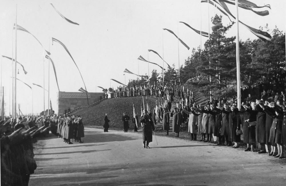 Pieminekļa kritušajiem cīņā ar Bermotu 6. Rīgas kājnieku pulka kareivjiem atklāšana Sudrabkalniņā. Latvijas armijas vads, mazpulki un pasākuma dalībnieki sagaida Latvijas valsts un ministru prezidentu Kārli Ulmani.