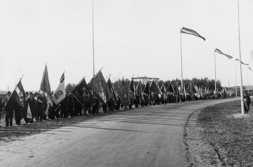 Pieminekļa kritušajiem 6. Rīgas kājnieku pulka kareivjiem atklāšana Sudrabkalniņā. Latvijas Valsts un Ministru prezidenta Kārļa Ulmaņa sagaidīšanas laikā skats uz karogoto ceļu līdz piemineklim.