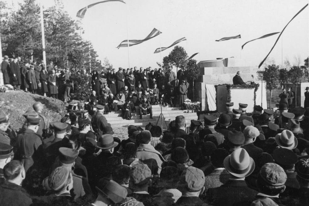 Pieminekļa kritušajiem 6. Rīgas kājnieku pulka kareivjiem atklāšana Sudrabkalniņā. Tribīnē no labās: 1. Latvijas Valsts un Ministru prezidents Kārlis Ulmanis uzrunā klātesošos svinību dalībniekus. Otrajā plānā uz kāpnēm sēž kritušo karavīru piederīgie.