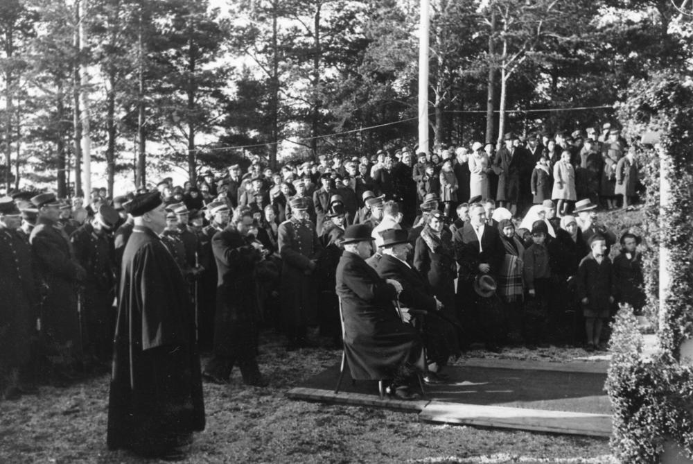 Pieminekļa kritušajiem 6. Rīgas kājnieku pulka kareivjiem atklāšana Sudrabkalniņā. No kreisās: 1. Latvijas armijas kapelāns Pēteris Apkalns, 2. kara ministrs Jānis Balodis, 3. Latvijas Valsts un Ministru prezidents Kārlis Ulmanis, 4. stāv Rīgas kājnieku pulka pieminekļa celšanas biedrības priekšniece Emma Albertiņa - Balode.