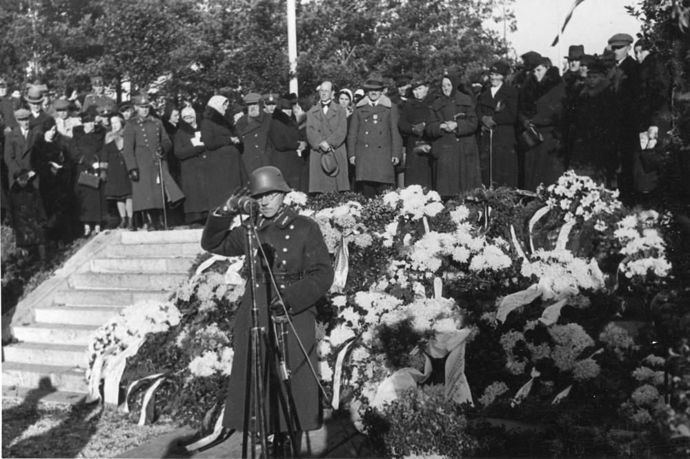 Pieminekļa kritušajiem 6. Rīgas kājnieku pulka karavīriem atklāšana Sudrabkalniņā. Centrā Rīgas kājnieku pulka komandieris, pulkvedis Jānis Liepiņš.