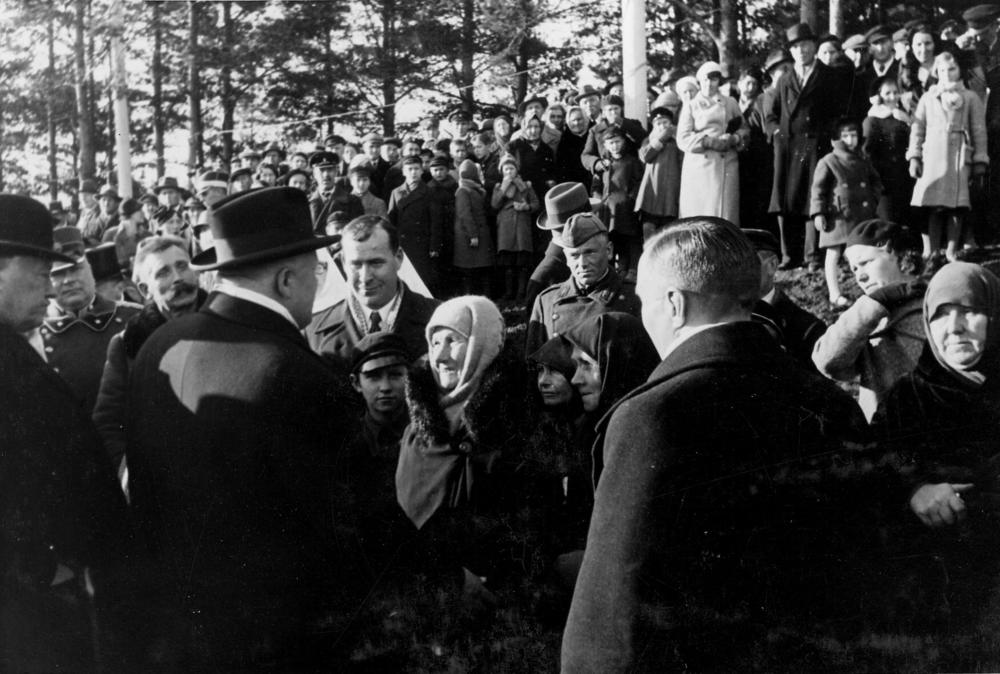 Pieminekļa kritušajiem 6. Rīgas kājnieku pulka kareivjiem atklāšana Sudrabkalniņā. Latvijas Valsts un Ministru prezidents Kārlis Ulmanis (no kreisās 1.) sarunājas ar Rīgas kājnieku pulka kritušo piederīgajiem.