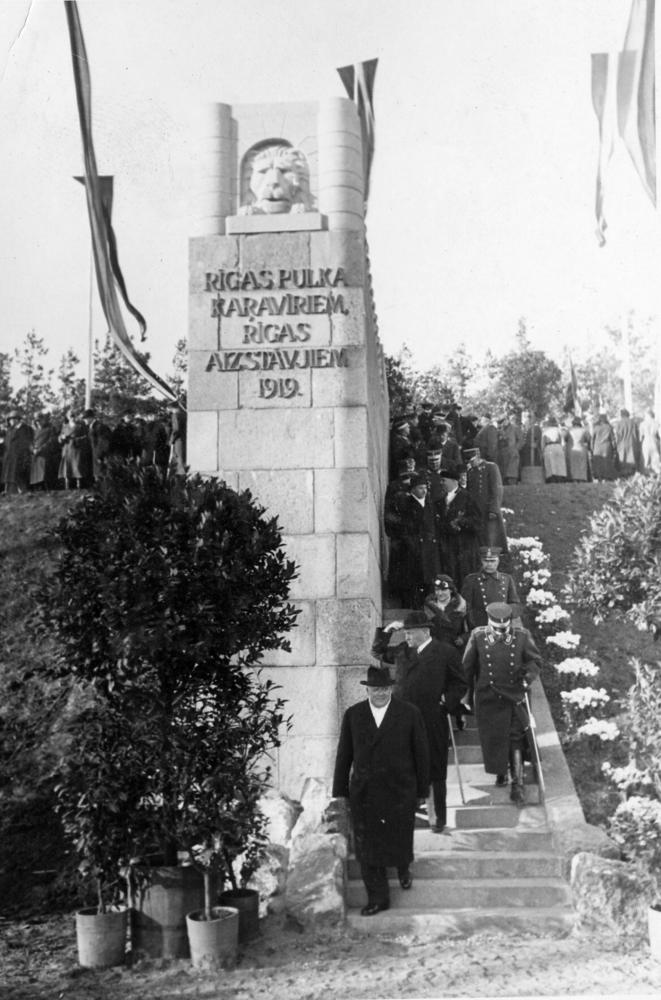 Pieminekļa kritušajiem cīņā ar Bermotu 6. Rīgas kājnieku pulka kareivjiem atklāšana Sudrabkalniņā. No kreisās puses: 1.Latvijas valsts un ministru prezidents Kārlis Ulmanis, 2. kara ministrs, ģenerālis Jānis Balodis, 3. Rīgas kājnieku pulka celšanas biedrības priekšniece Emma Balode-Albertiņa, 4. Latvijas armijas kapelāns Pēteris Apkalns, 5. Rīgas prefekts Pēteris Pommers, pēc pieminekļa atklāšanas ceļā uz svinību noslēguma parādi.