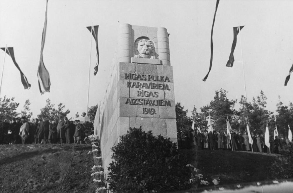 Piemineklis kritušajiem 6. Rīgas kājnieku pulka karavīriem Sudrabkalniņā atklāšanas dienā. Uz tēlnieka Kārļa Zāles veidotā pieminekļa uzraksts: "Rīgas pulka karavīriem. Rīgas aizstāvjiem 1919".