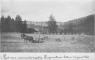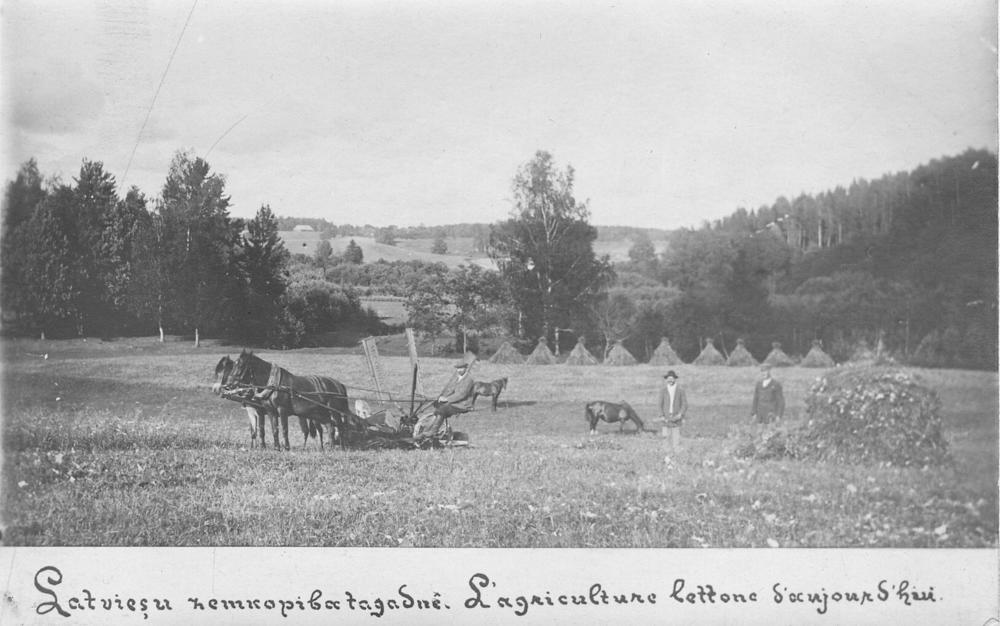 Siena novākšanas darbi latviešu zemnieka sētā. Priekšplānā siena pļaušana ar zirga siena pļaumašīnu, fonā redzami labības kūlīši. Fotoatklātne.
