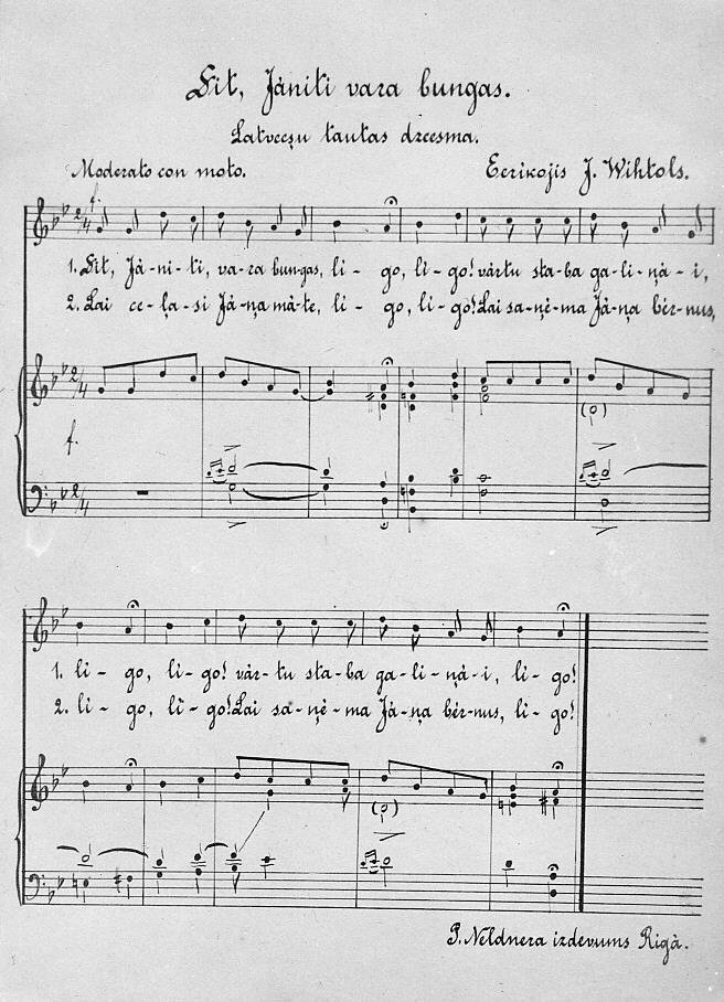 Latviešu tautasdziesmas "Sit, Jānīti, vara bungas" nošu fotokopija no Jurjānu Andreja krājuma "Latvju tautas mūzikas materiāli”. Krājumu izdevusi Rīgas Latviešu biedrības Muzikas komisija, redaktors Pāvuls Neldners.