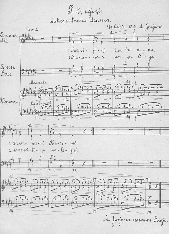 Latviešu tautasdziesmas "Pūt, vējiņi" nošu fotokopija no Jurjānu Andreja krājuma "Latvju tautas mūzikas materiāli”. Krājumu izdevusi Rīgas Latviešu biedrības Muzikas komisija, redaktors Pāvuls Neldners.