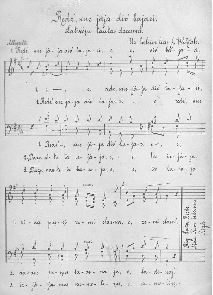 Latviešu tautasdziesmas "Redz, kur jāja div' bajāri" nošu fotokopija no Jurjānu Andreja krājuma "Latvju tautas mūzikas materiāli”. Krājumu izdevusi Rīgas Latviešu biedrības Muzikas komisija, redaktors Pāvuls Neldners.