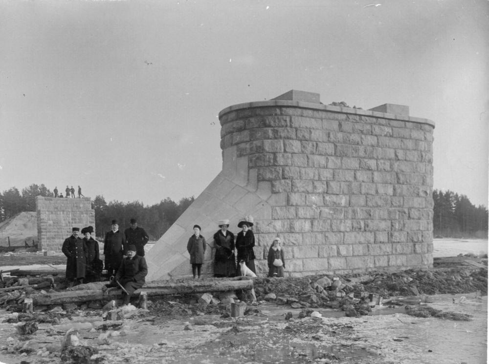 Dzelzceļa tilta pāri Gaujas upei vidējais balsts celtniecības laikā.