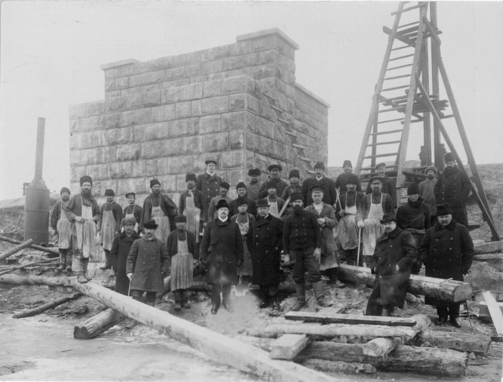 Dzelzceļa būvnieki pie tilta pāri Gaujas upei balsta būvniecības laikā.