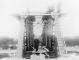 Dzelzceļa tilta pāri Gaujas upei celtniecības darbi - metāla konstrukciju uzstādīšana. Darbinieki uz konstrukcijām, tilta vidū uz pagaidu tilta seguma stāv dzelzceļa līnijas Smiltene-Valmiera-Ainaži projekta autors un finansētājs Pauls Ivans fon Līvens.