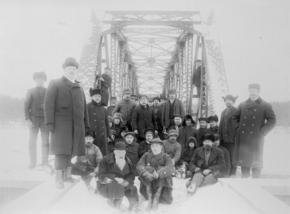 Dzelzceļa būvnieki uz pabeigtā dzelzceļa tilta pāri Gaujas upei. Grupas foto.