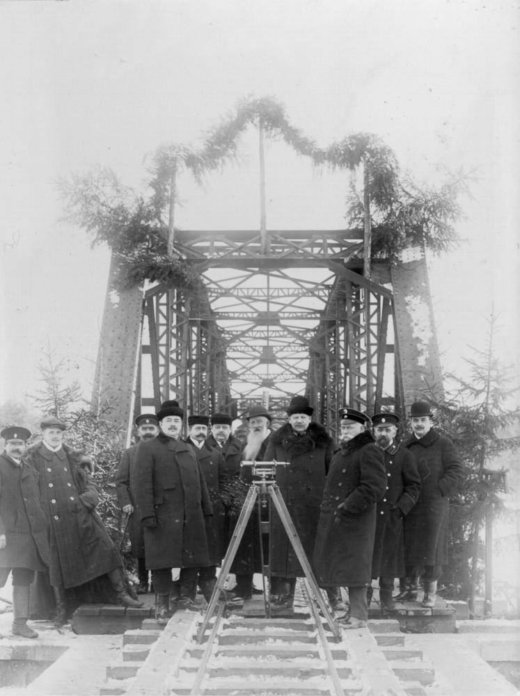 Dzelzceļa tilta pāri Gaujai svinīgais atklāšanas pasākums. Grupas foto uz tilta.