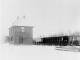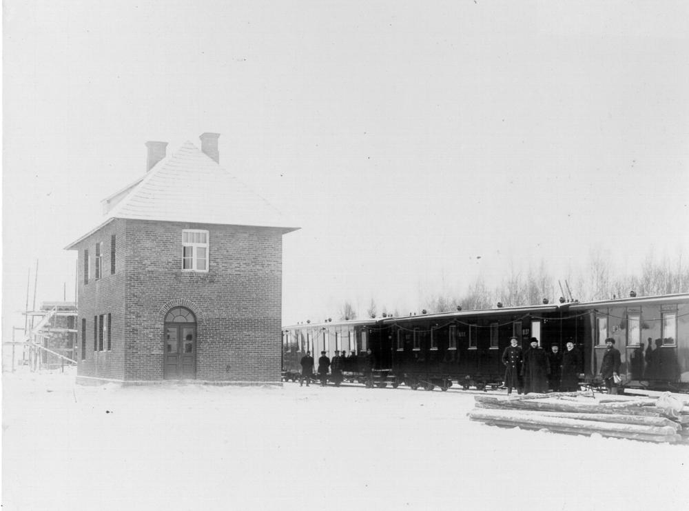 Dauguļu dzelzceļa stacijas ēka ziemā.