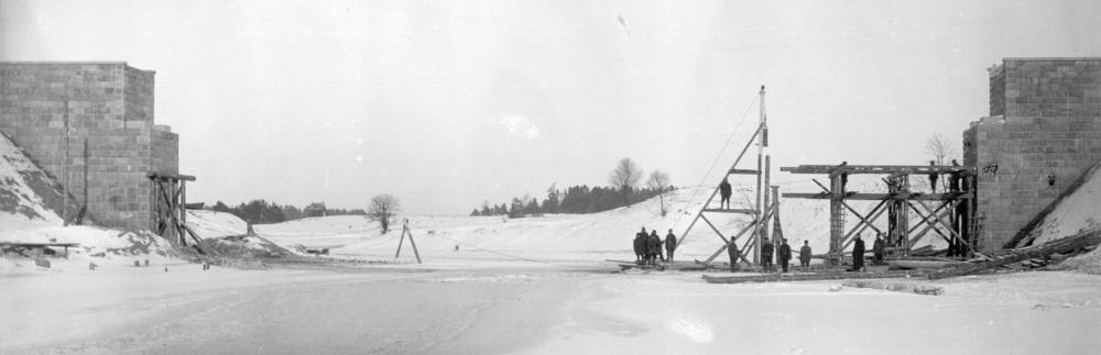 Dzelzceļa tilta celtniecība pāri upei Salacas upei ziemas sezonā. Posms šaursliežu dzelzceļa līnijā Ainaži–Valmiera.