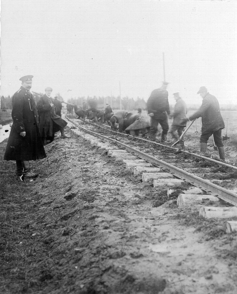 Dzelzceļa sliežu celtniecība posmā Salaca - Ainaži.
