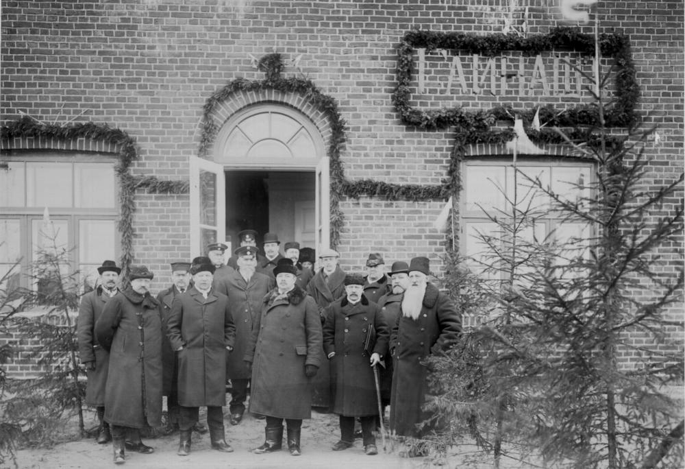 Ierēdņu grupa pie Ainažu dzelzceļa stacijas ēkas (1912) pirmās lokomotīves pienākšanas svētkos.