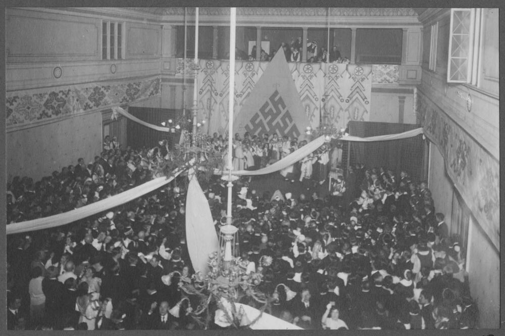 Saviesīgā vakara “Senču kāzas” viesi un pasākuma rīkotāji Armijas virsnieku kluba zālē.