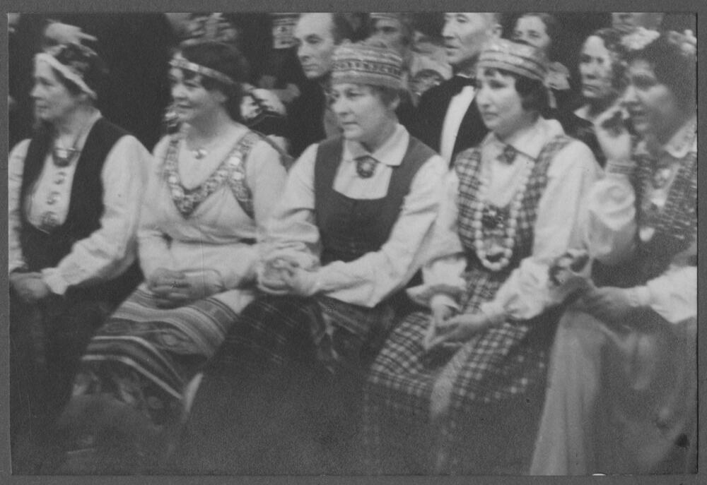 Saviesīgā vakara “Senču kāzas” Virsnieku klubā dalībnieces savos nacionālajos tautas tērpos. No kreisās: 1. gleznotāja Jaņa Rozentāla kundze, somu dziedātāja Ellija Forsele-Rozentāle (Elli Forssell), 2. Latvijas bruņoto spēku komandiera Krišjāņa Berķa kundze somiete Hilma Lehtonene, 3. tieslietu ministra Hermaņa Apsīša kundze Milda Apsīte (dzimusi Cīrule) 4. iekšlietu ministra biedra Alfrēda Bērziņa kundze Alīne Bērziņa (iepriekš Nolle, dzimusi Šāberte).