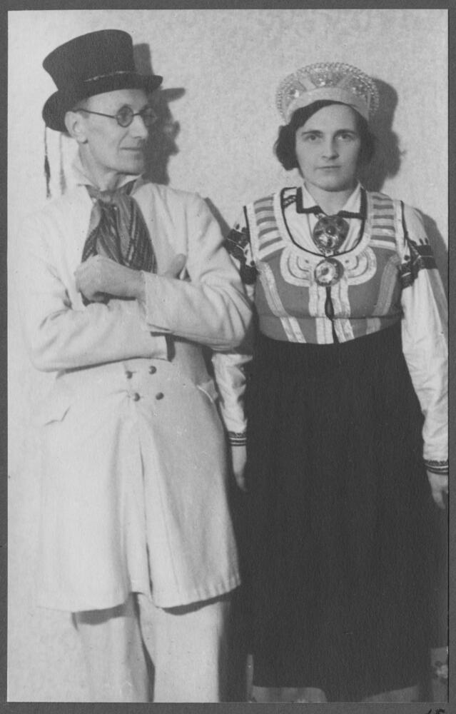 Saviesīgā vakara “Senču kāzas” namatēvs, Rīgas pilsētas Aizgādības valdes priekšnieks Markus Ozols ar kundzi Līviju Ozolu-Grīnšteini. Dubultportrets.