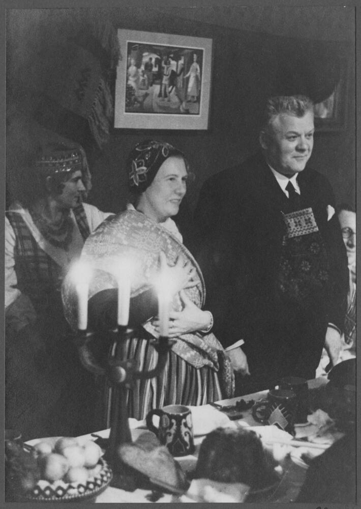 Saviesīgā vakara “Senču kāzas” viesi pie mielasta galda. No kreisās: 2. pasākuma namamāte, žurnāla “Atpūta” izdevēja Emīlija Benjamiņa, 3. Latvijas Ministru prezidents un ārlietu ministrs Kārlis Ulmanis.