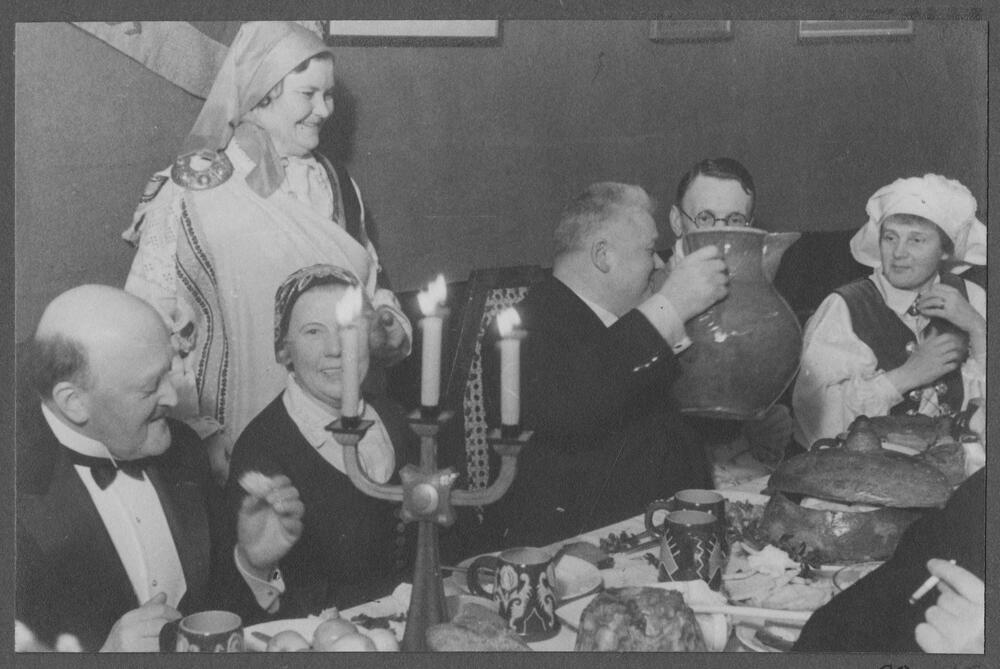 Saviesīgā vakara “Senču kāzas” viesi pie mielasta galda. No kreisās: 1. Zviedrijas ārkārtējais sūtnis un pilnvarotais ministrs Latvijā Patriks de Reitersverds, 2. pasākuma namamāte, žurnāla “Atpūta” izdevēja Emīlija Benjamiņa, 3. Latvijas Ministru prezidents un ārlietu ministrs Kārlis Ulmanis, 4. pasākuma namatēvs, Rīgas pilsētas Aizgādības valdes priekšnieks Markus Ozols, 5. Zviedrijas sūtņa Latvijā Patrika de Reitersverda kundze.