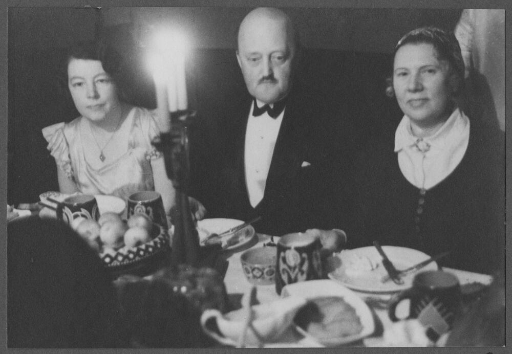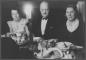 Saviesīgā vakara “Senču kāzas” viesi pie mielasta galda. No kreisās sēž: 2. Zviedrijas ārkārtējais sūtnis un pilnvarotais ministrs Latvijā Patriks de Reitersverds, 3. pasākuma namamāte, žurnāla “Atpūta” izdevēja Emīlija Benjamiņa.