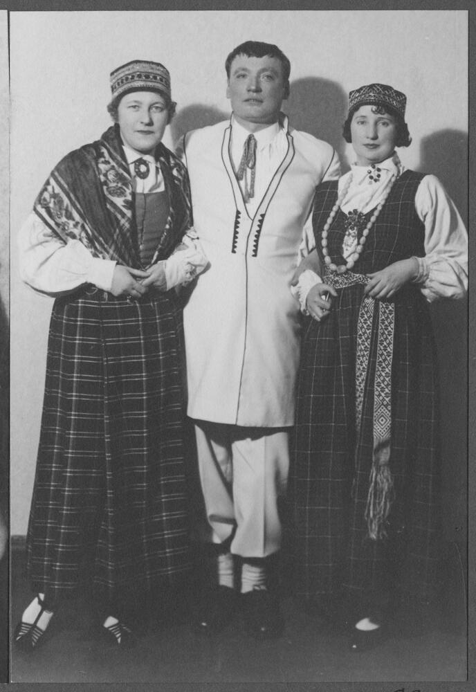 Saviesīgs vakars "Senču kāzas" Armijas virsnieku klubā. Vakara dalībnieki tautas tērpos no kreisās: 1. tieslietu ministra Hermaņa Apsīša dzīvesbiedre Milda Apsīte, 2. gleznotājs, publicists, Dievturu draudzes izveidotājs un dižvadonis Ernests Brastiņš, 3. iekšlietu ministra biedra Alfrēda Bērziņa dzīvesbiedre Alīne Bērziņa.
