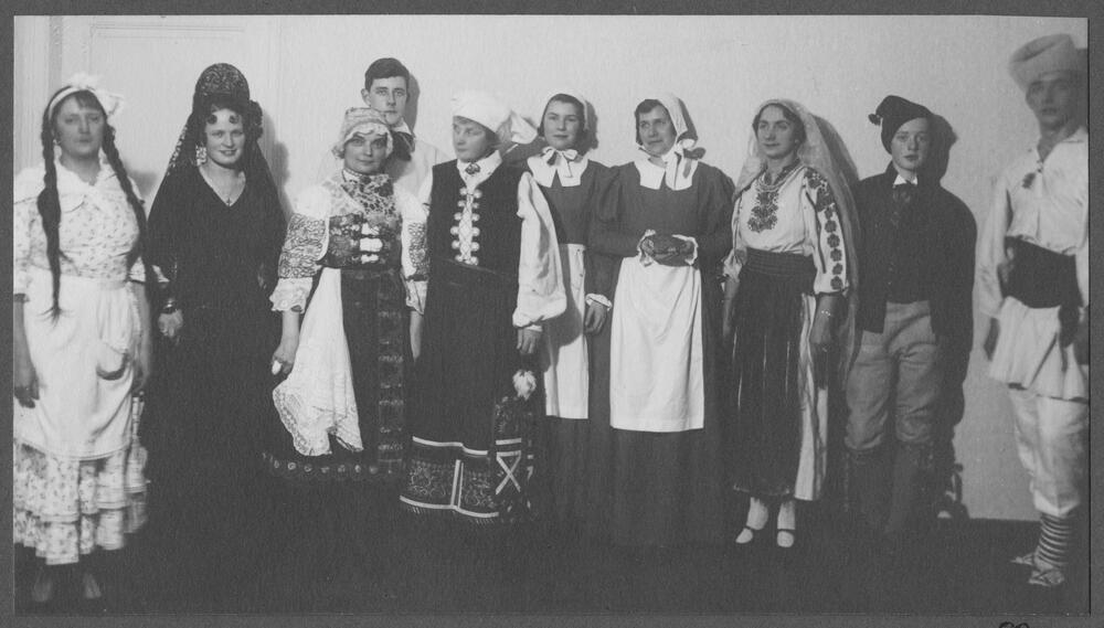 Saviesīgā vakara “Senču kāzas” Virsnieku klubā dalībnieces savos nacionālajos tautas tērpos. No kreisās: 1. Argentīnas konsula Latvijā Giljermo Kellera (Guillermo Keller) kundze, 2. Spānijas sūtņa Jesus de Encio y Cortes kundze, 3. Čehoslovākijas sūtņa Jaroslava Līpas kundze, 4. Zviedrijas sūtņa Patrika fon Reitersvērda (von Reutersvärd) dēls, 5. Zviedrijas sūtņa Patrika fon Reitersvērda kundze, 7. Amerikas Savienoto Valstu (ASV) sūtņa Džona Vana Makmareja (John Van A. MacMurray) kundze, 8. Rumānijas sūtņa prinča Mihaila Sturdzas kundze, 9. Zviedrijas sūtņa Patrika fon Reitersvērda dēls.