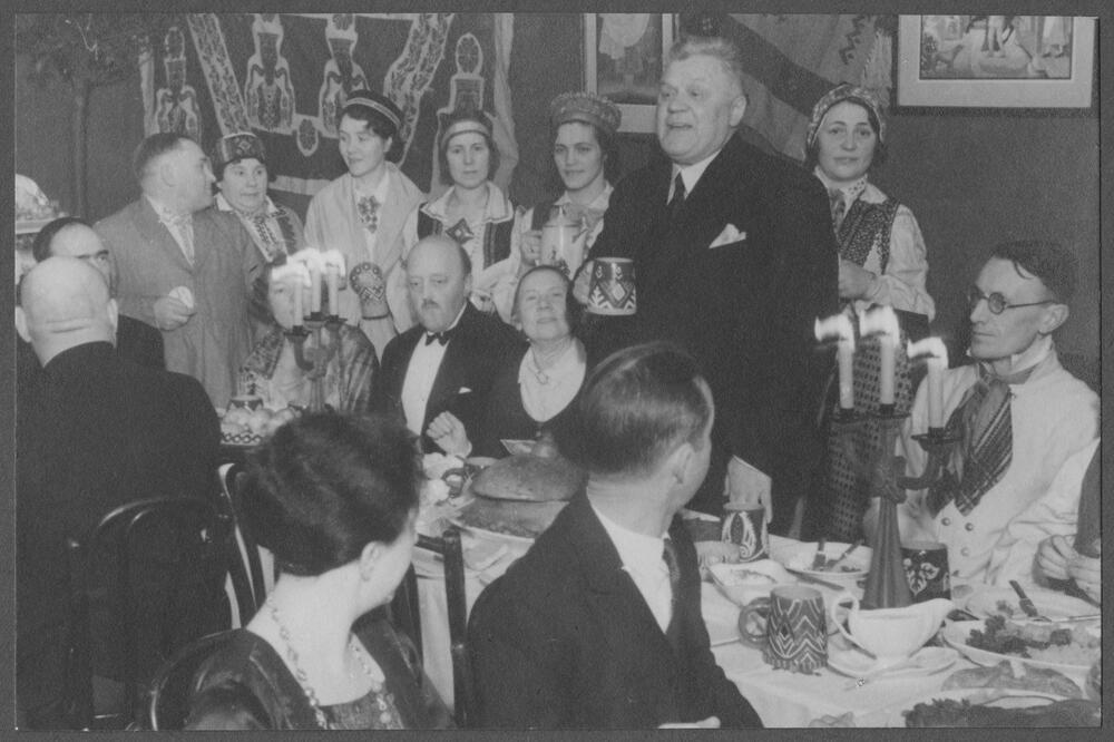 Saviesīgā vakara “Senču kāzas” viesi pie mielasta galda. Otrajā plānā no labās: 1. pasākuma namatēvs, Rīgas pilsētas Aizgādības valdes priekšnieks Markus Ozols, 2. runu saka Latvijas Ministru prezidents un ārlietu ministrs Kārlis Ulmanis, 3. pasākuma namamāte, žurnāla “Atpūta” izdevēja Emīlija Benjamiņa, 4. Zviedrijas ārkārtējais sūtnis un pilnvarotais ministrs Latvijā Patriks de Reitersverds.