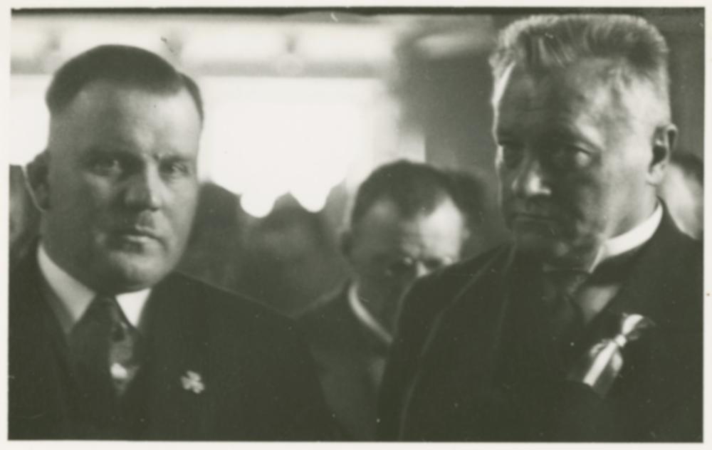 Latvijas Zemnieku savienības kongresa delegāti, sēžu zālē Rīgas Latviešu biedrības namā. No kreisās: 1. Latvijas Zemnieku savienības pārstāvis, 4. Saeimas deputāts, zemkopības ministra biedrs Jānis Birznieks, 2. kara ministrs, ģenerālis Jānis Balodis.