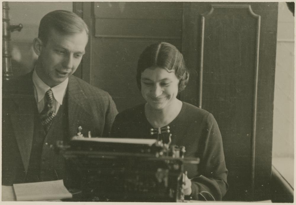 Latvijas Zemnieku savienības delegāti kongresa starplaikā, Rīgas Latviešu biedrības namā. Iespējams, kongresa lēmumu pārrakstīšana (?).